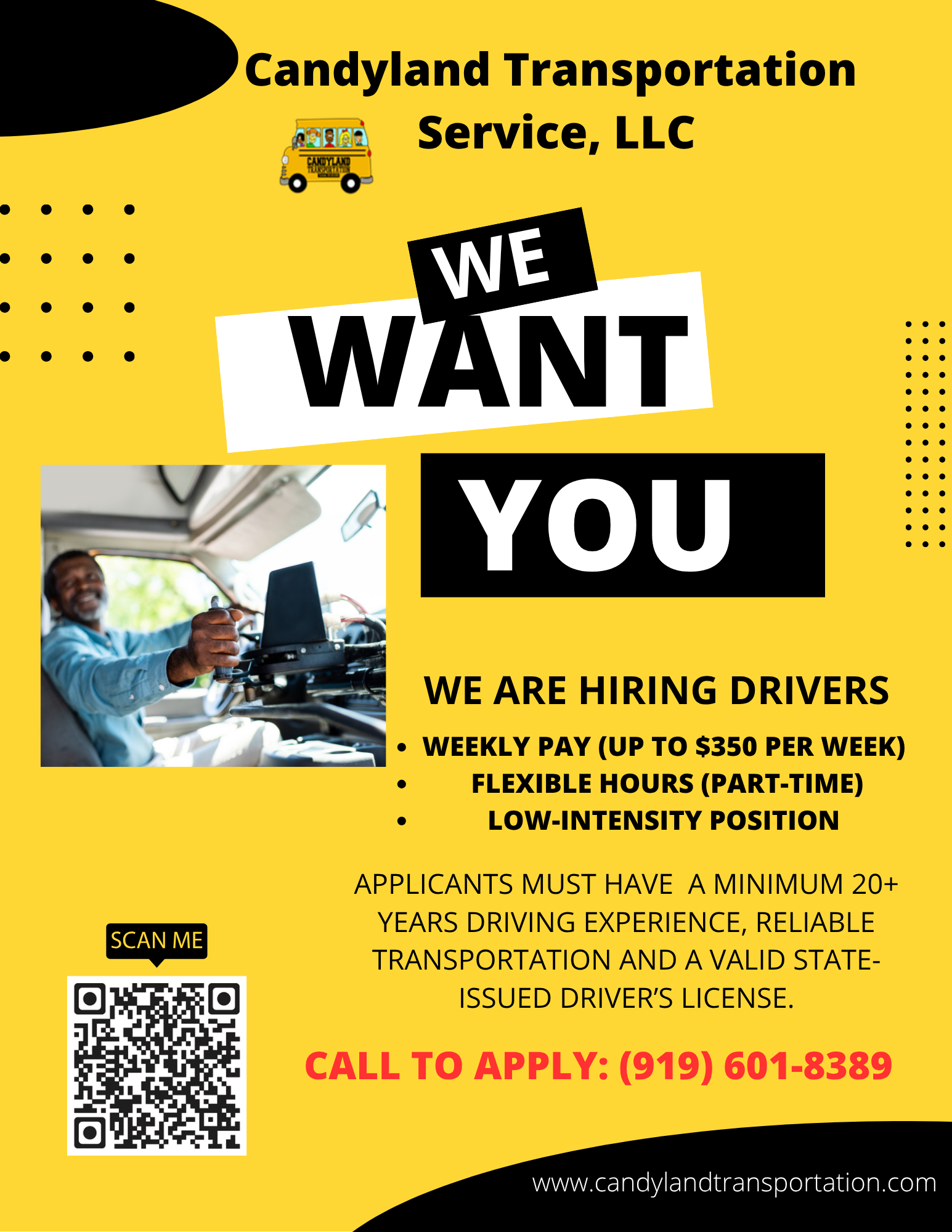 Saved By the Bell 2, LLC and Candyland Transportation Service, LLC is an equal opportunity employer. We do not discriminate against any employee or applicant for employment based on race, color, religion, sex, national origin, age, disability, genetic information, or any other characteristic protected by federal, state, or local law. By submitting this application, I confirm that the information provided is accurate, and I understand that any false statements may disqualify me from employment.